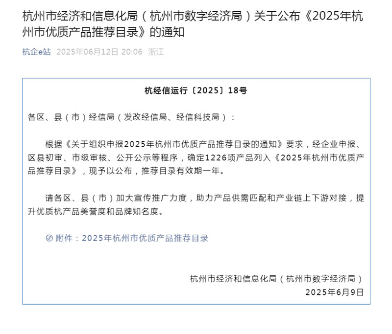 “杭州市優(yōu)質產品推薦目錄”是杭州市經信局貫徹落實“新制造業(yè)計劃”的一項重要舉措,旨在通過各項技術經濟和質量方針對杭州市好產品進行認定和展示,加大優(yōu)質產品的推廣力度。入選產品不僅在技術研發(fā)、數(shù)字化、智能制造等領域表現(xiàn)卓越,更需要具備顯著的市場應用價值。