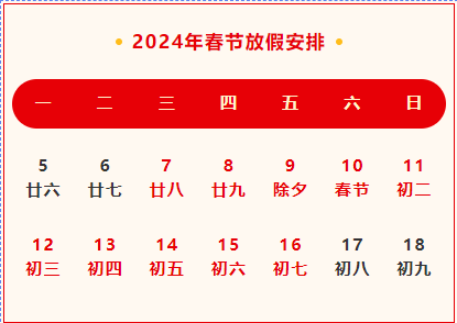 2024年春節(jié)將至,根據(jù)國家有關(guān)政策,同時結(jié)合公司相關(guān)規(guī)定,現(xiàn)將春節(jié)放假通知如下: